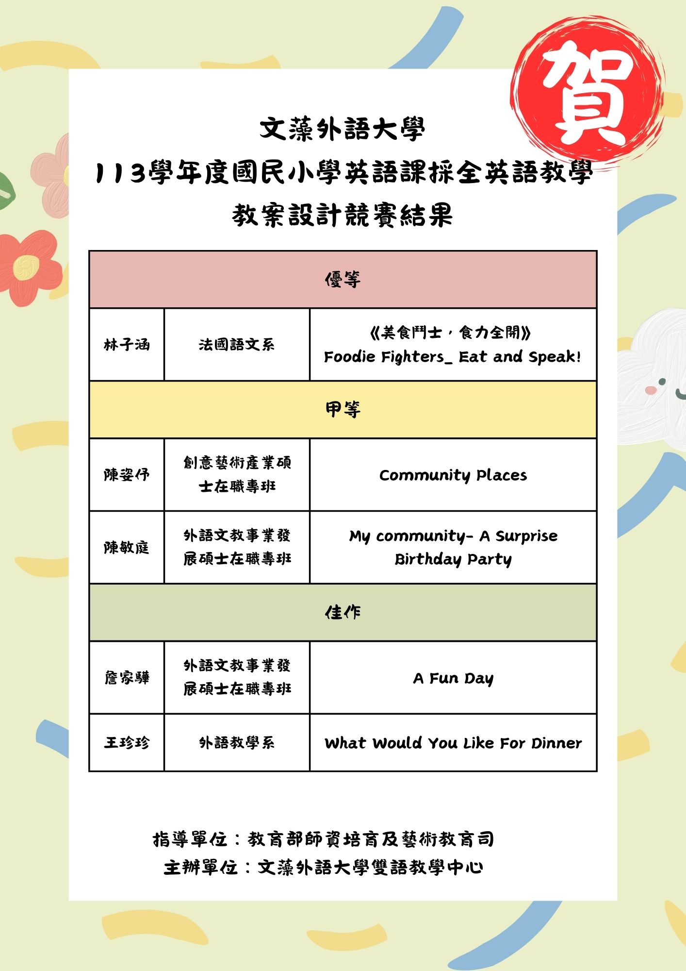 [競賽結果] 113學年度國民小學英語課採全英語教學教案設計競賽—比賽結果