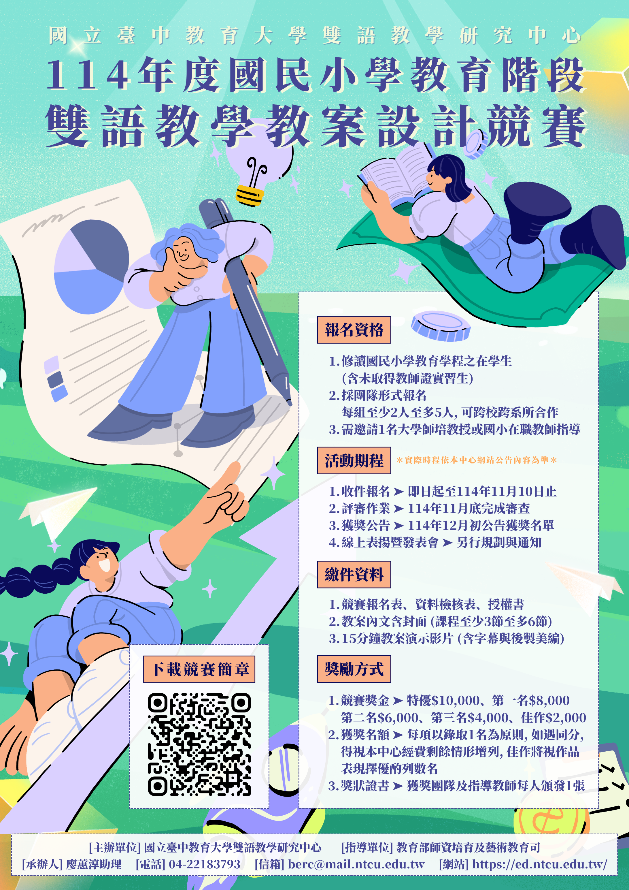 [宣傳]國立臺中教育大學辦理「114年度國民小學教育階段雙語教學教案設計競賽」,歡迎師資生踴躍報名參加。